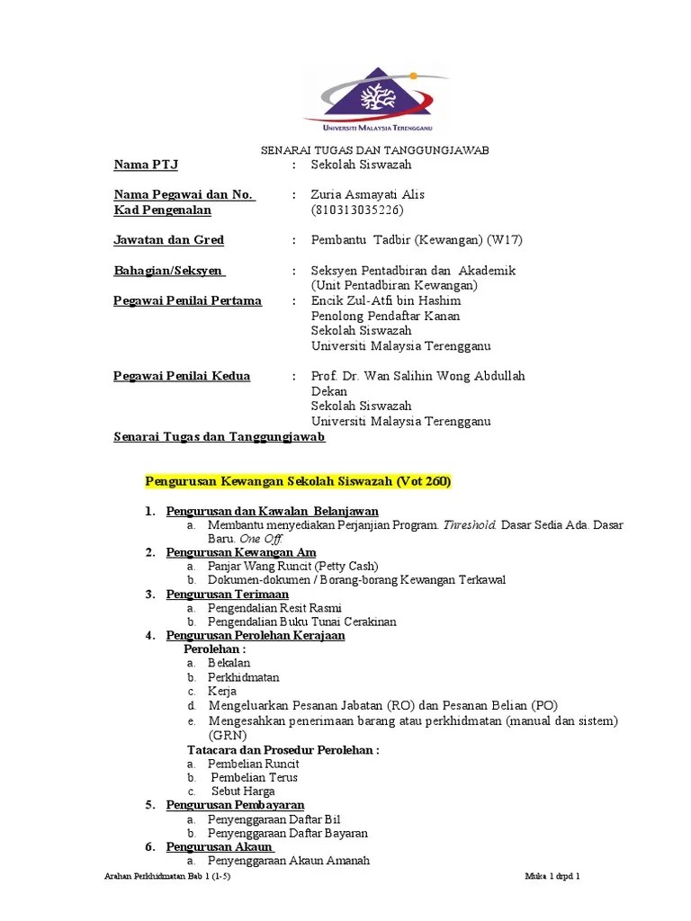 Senarai tugas pembantu tadbir (kewangan) gred w19 spa. Tatacara pengurusan kewangan dan akaun sekolah;. Pembantu tadbir (kewangan) gred w17. Tugas pembantu tadbir sekolah 1.0 menyediakan lembaran gaji setiap bulan.